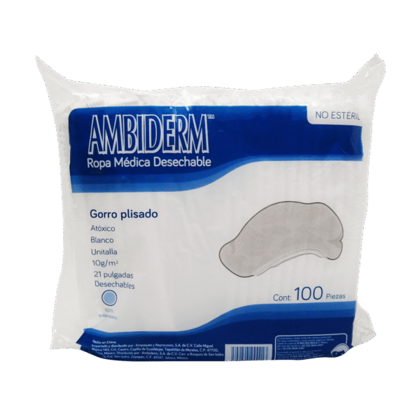 Gorro plisado y gorro para paciente 100% Polipropileno, atóxico, empaque de bolsa polietileno, no estéril, 10 gramos, libre de látex.